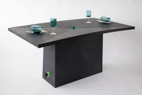 El agua que cae en la mesa cuando llueve, es recogida por su tablero y almacenada en un depósito situado debajo, un elemento que a su vez es el soporte de la propia mesa.